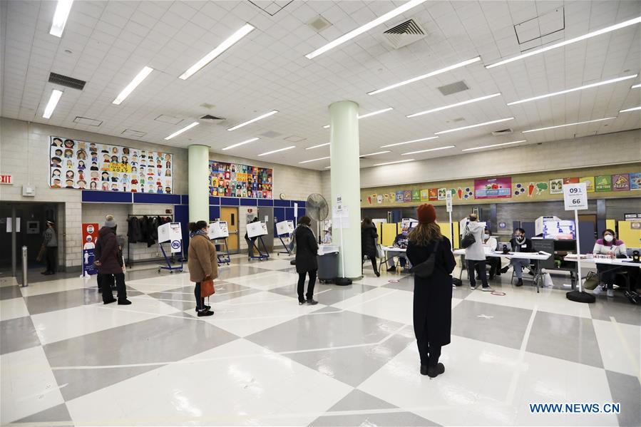 Voters line up to register at a polling station in New York, the United States, on Nov. 3, 2020. Voting on Election Day is underway across the United States, as the COVID-19 pandemic is raging on and political divide running deeper. (Xinhua/Wang Ying)