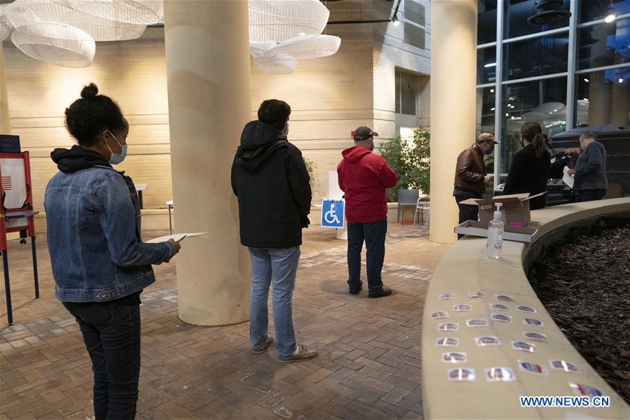 People line up to vote at a polling station in Arlington, Virginia, the United States, Nov. 3, 2020. Voters in major cities along the east coast of the United States started to cast their ballots early Tuesday, as polls continue to open across the country to decide the presidency. (Xinhua/Liu Jie)
