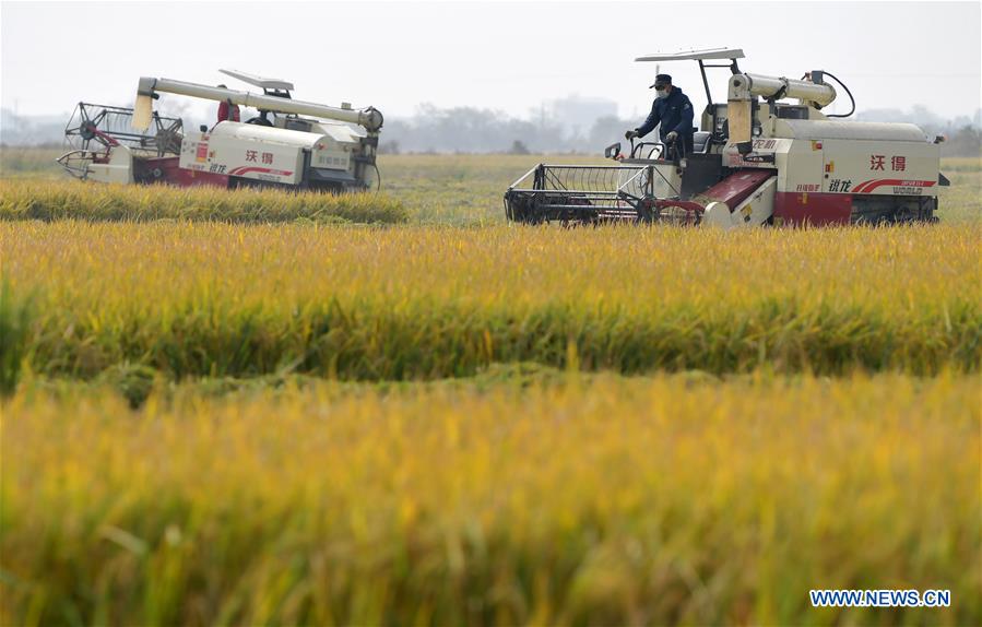Photo taken on Nov. 3, 2020 shows farmers harvesting paddy rice in Jiangxiang Town, Nanchang of east China's Jiangxi Province. (Xinhua/Peng Zhaozhi)