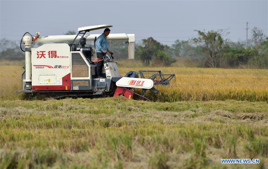 Photo taken on Nov. 3, 2020 shows a farmer harvesting paddy rice in Jiangxiang Town, Nanchang of east China's Jiangxi Province. (Xinhua/Peng Zhaozhi)