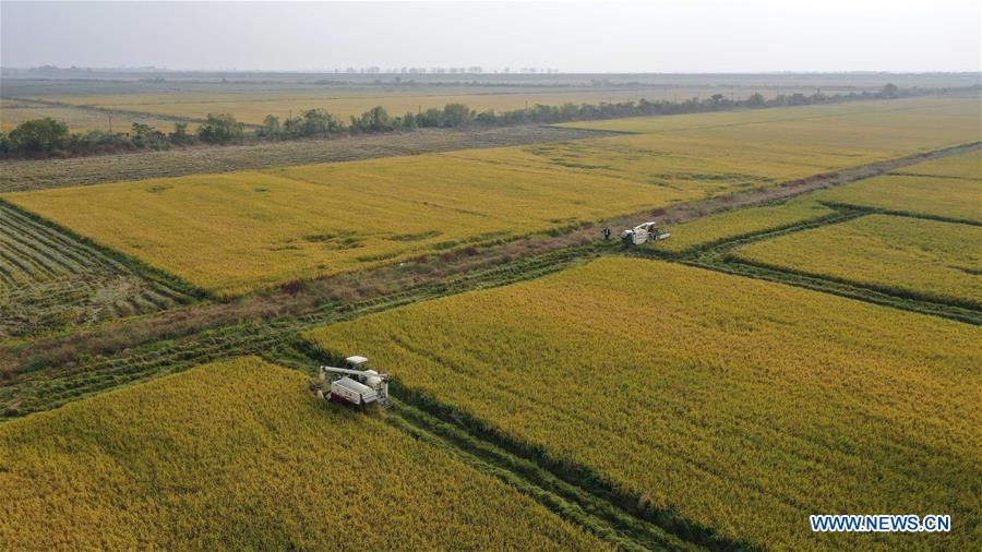 Aerial photo taken on Nov. 3, 2020 shows farmers harvesting paddy rice in Jiangxiang Town, Nanchang of east China's Jiangxi Province. (Xinhua/Peng Zhaozhi)