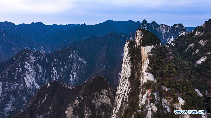 Aerial photo taken on Nov. 3, 2020 shows the Jinsuo Pass of Mount Huashan at dawn in northwest China's Shaanxi Province. (Xinhua/Tao Ming)