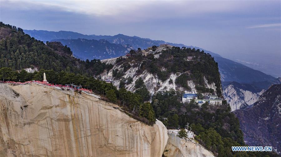 Aerial photo taken on Nov. 3, 2020 shows the East Peak of Mount Huashan at dawn in northwest China's Shaanxi Province. (Xinhua/Tao Ming)