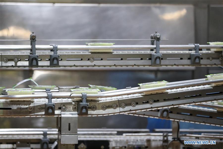 Photo taken on Nov. 3, 2020 shows boxed tofu products on the assembly line at a tofu plant of Pulmuone in Eumseong-gun of Chungcheongbuk-do, South Korea. Pulmuone, a leading food company in South Korea, will be an exhibitor at the third China International Import Expo (CIIE), which will take place from Nov. 5 to 10 in Shanghai. (Xinhua/Wang Jingqiang)