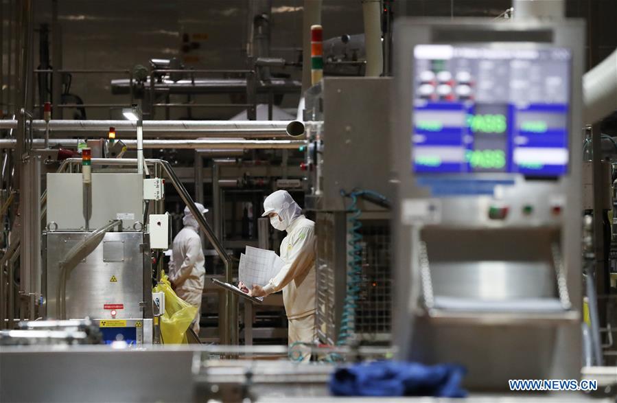 Staff members work at a tofu plant of Pulmuone in Eumseong-gun of Chungcheongbuk-do, South Korea, Nov. 3, 2020. Pulmuone, a leading food company in South Korea, will be an exhibitor at the third China International Import Expo (CIIE), which will take place from Nov. 5 to 10 in Shanghai. (Xinhua/Wang Jingqiang)
