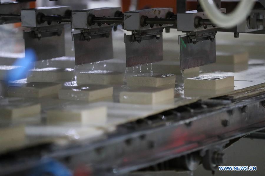 Photo taken on Nov. 3, 2020 shows tofu being cut into cubes on the assembly line at a tofu plant of Pulmuone in Eumseong-gun of Chungcheongbuk-do, South Korea. Pulmuone, a leading food company in South Korea, will be an exhibitor at the third China International Import Expo (CIIE), which will take place from Nov. 5 to 10 in Shanghai. (Xinhua/Wang Jingqiang)