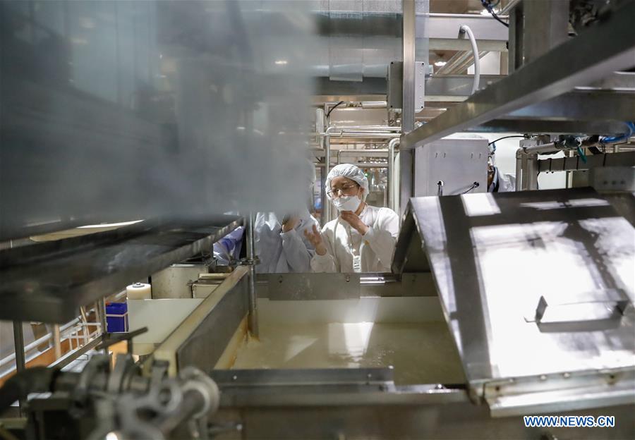 A staff member introduces the manufacturing procedures at a tofu plant of Pulmuone in Eumseong-gun of Chungcheongbuk-do, South Korea, Nov. 3, 2020. Pulmuone, a leading food company in South Korea, will be an exhibitor at the third China International Import Expo (CIIE), which will take place from Nov. 5 to 10 in Shanghai. (Xinhua/Wang Jingqiang)