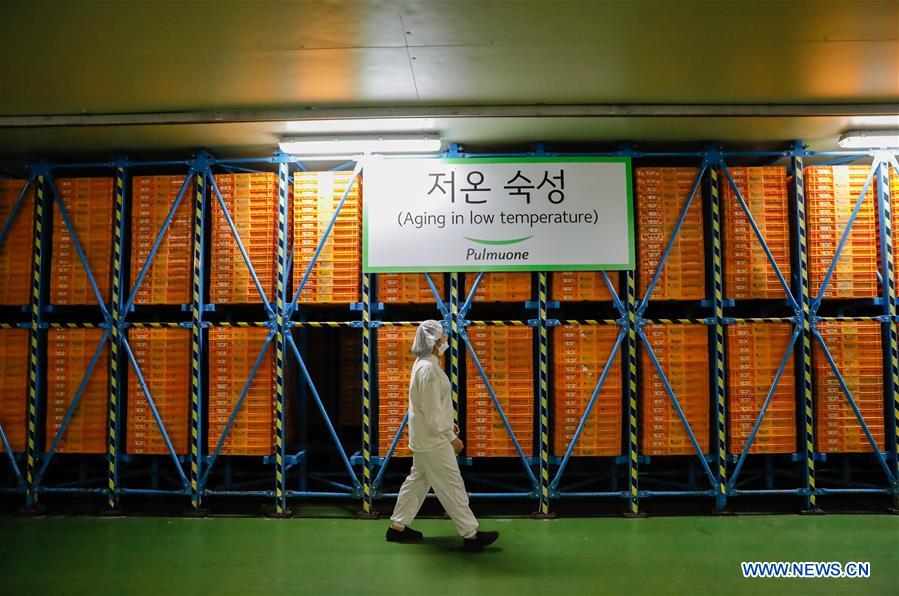 A staff member checks on boxed tofu products for distribution logistics at a tofu plant of Pulmuone in Eumseong-gun of Chungcheongbuk-do, South Korea, Nov. 3, 2020. Pulmuone, a leading food company in South Korea, will be an exhibitor at the third China International Import Expo (CIIE), which will take place from Nov. 5 to 10 in Shanghai. (Xinhua/Wang Jingqiang)