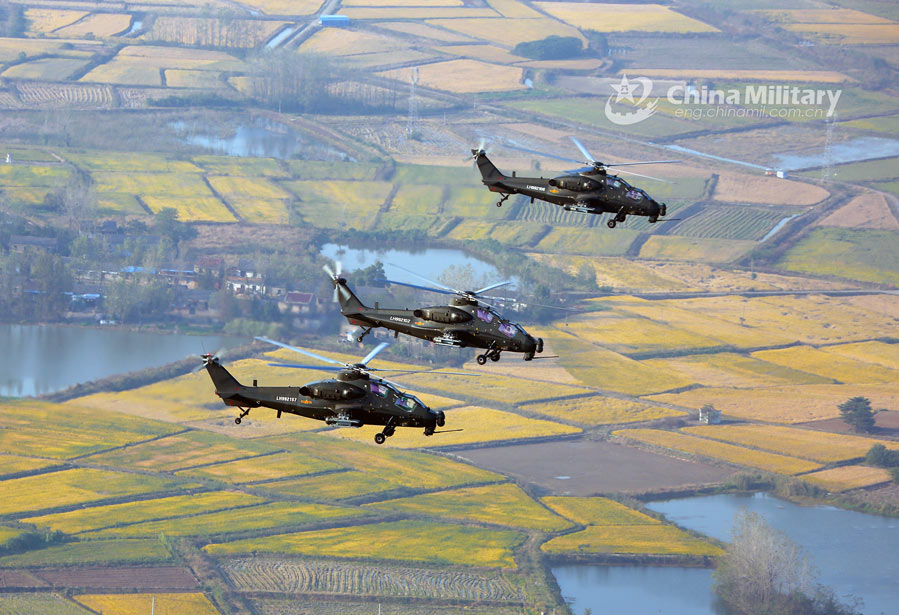 Three WZ-10 attack helicopters attached to an army aviation brigade under the PLA 72nd Group Army fly over terraced fields during a flight training exercise on October 24, 2020. (eng.chinamil.com.cn/Photo by Zhang Huanpeng)