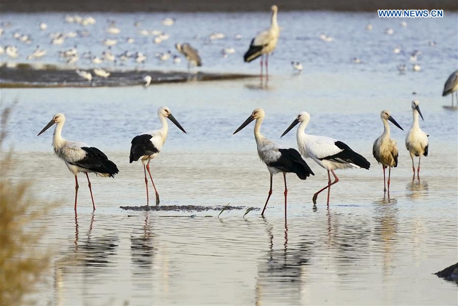 Oriental white storks seen at Caofeidian wetland in Hebei