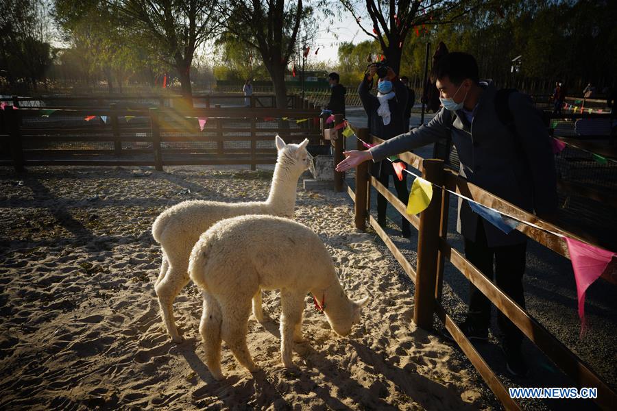 Visitors feed alpacas at a rural tourism complex in Fengnan District of Tangshan, north China's Hebei Province, Nov. 3, 2020. (Xinhua/Xing Guangli)