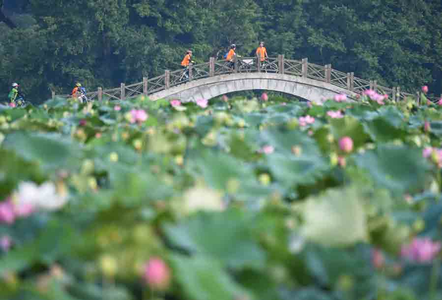 Visitors admire the lotus fields in Xiuzhu village, Jianning county, Sanming. SONG WEIWEI/XINHUA