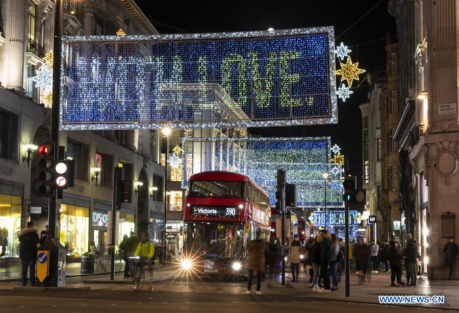 Photo taken on Nov. 3, 2020 shows the Christmas lights illuminating the main shopping Oxford Street, in London, Britain. Oxford Street Christmas lights were switched on from Monday. The lights pay tribute to the strength and brilliance of Londoners and also honor those who've demonstrated kindness and steadfast support to others during the pandemic. (Xinhua/Han Yan)