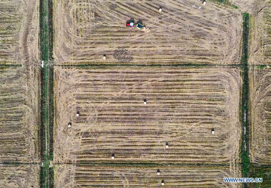Aerial photo taken on Nov. 3, 2020 shows an agricultural vehicle collecting rice straw in the field at Jiangxiang Town of Nanchang County, Nanchang, east China's Jiangxi Province. The recycling of rice straw is commonly conducted with the ongoing rice harvest. (Xinhua/Peng Zhaozhi)
