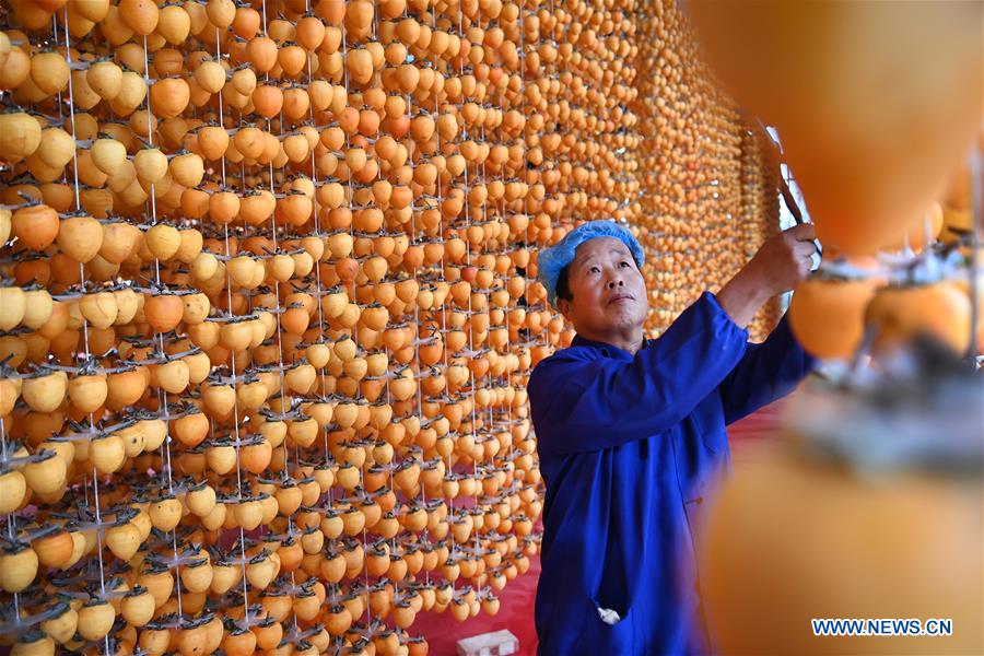 A villager cleans persimmons in Fuping county, northwest China's Shaanxi Province, Nov. 3, 2020. Local villagers lately have been busy harvesting and processing persimmons to dried snacks. With a planting area of more than 360,000 mu (24,000 hectares), the persimmon industry has boost local people's income and help 2,400 registered impoverished households to shake off poverty. (Xinhua/Tao Ming)