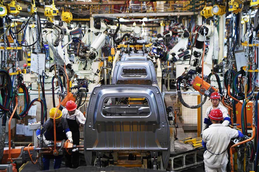 Workers assemble vehicles in a smart factory of Chang'an Kuayue Automobile Co., Ltd. in Wanzhou District, southwest China's Chongqing Municipality, Sept. 23, 2020. (Xinhua/Wang Quanchao)