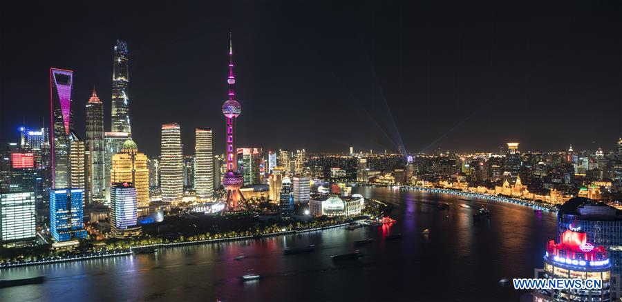 Photo taken on Nov. 4, 2020 shows a light show at the Lujiazui area in Shanghai, east China. A light show themed on the China International Import Expo (CIIE) was held in Lujiazui of Shanghai on Wednesday. (Xinhua/Zhang Haofu)