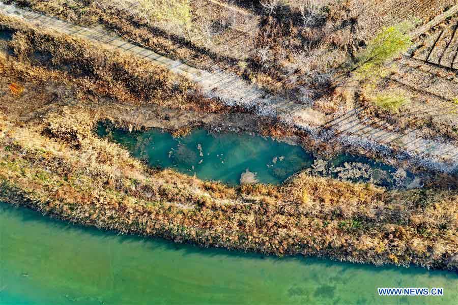 Aerial photo taken on Nov. 5, 2020 shows the view of a park along the Changhe River in Qianxi County, north China's Hebei Province. The park was transformed from a former mining area by renovating the river channel and improving the ecological environment. (Xinhua/Xing Guangli)