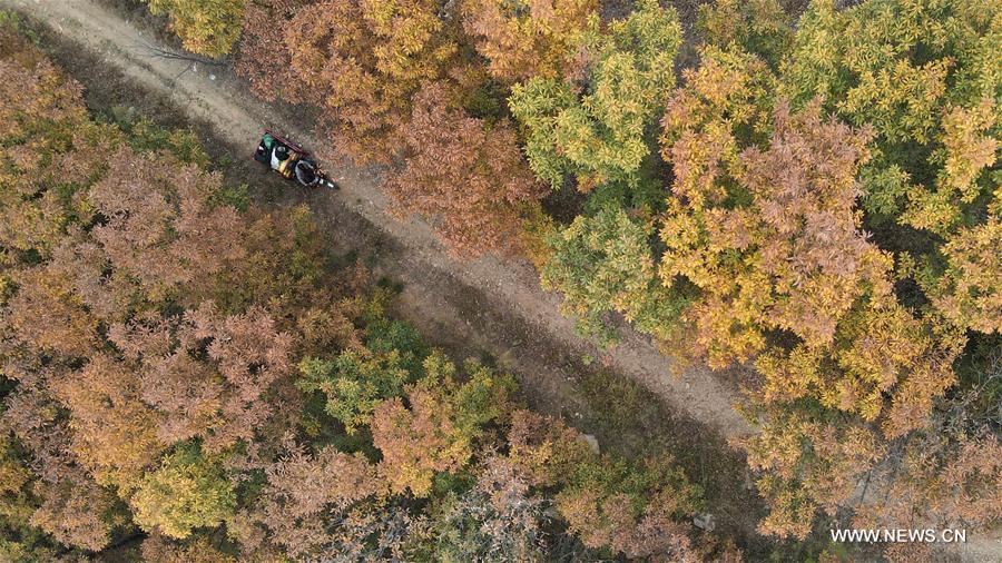 Aerial photo taken on Nov. 5, 2020 shows a vehicle running on the mountain road in Xindu District of Xingtai, north China's Hebei Province. (Xinhua/Luo Xuefeng)