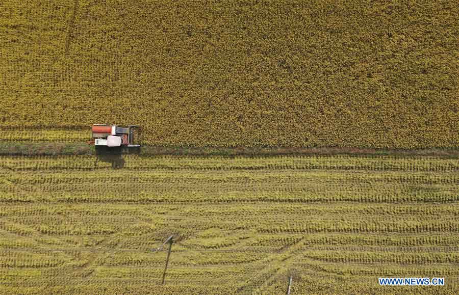 Aerial photo taken on Nov. 5, 2020 shows a farmer harvesting paddy rice in Qingcheng Village, Wanzai County of Yichun City, east China's Jiangxi Province. (Xinhua/Zhou Mi)