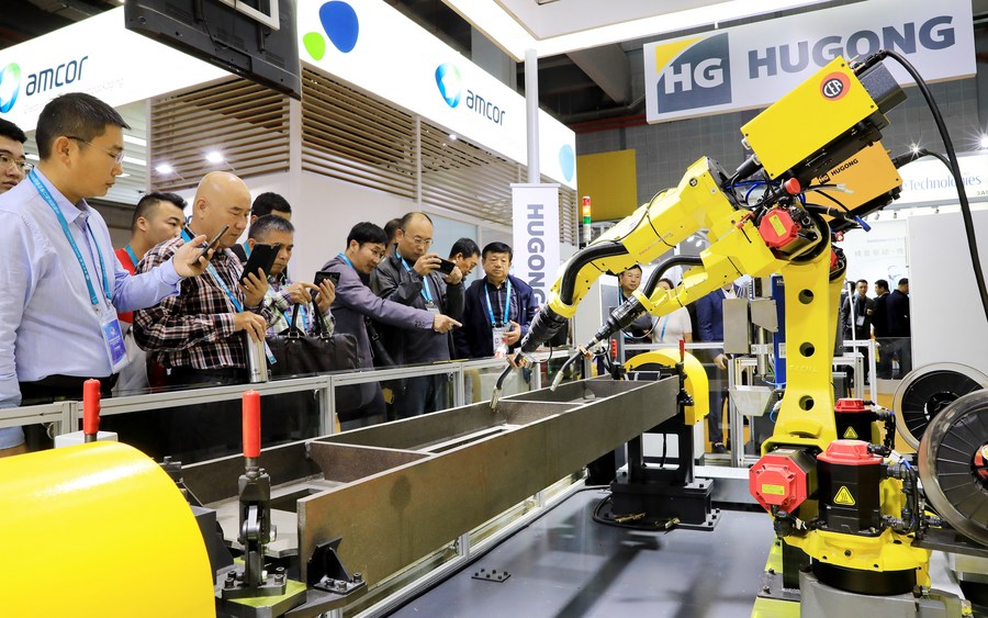 People watch welding robots operating at the Equipment exhibition area during the second China International Import Expo (CIIE) in Shanghai, east China, Nov. 6, 2019. (Xinhua/Fang Zhe)