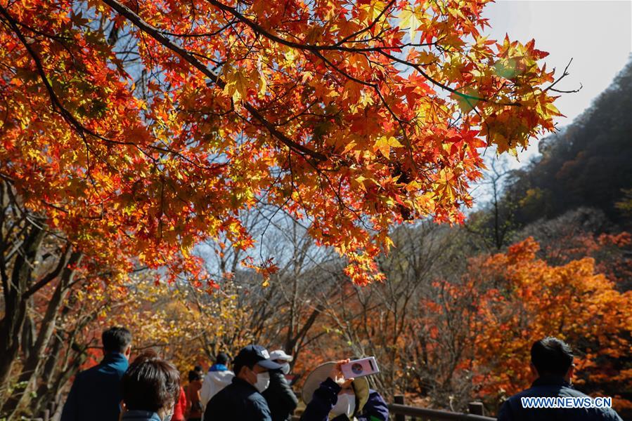 People walk under maple trees at Naejangsan National Park in Jeongeup City of North Jeolla Province, South Korea, Nov. 8, 2020. Naejangsan is a popular tourist destination in South Korea, particularly in autumn due to its spectacular maple scenery. (Xinhua/Wang Jingqiang)