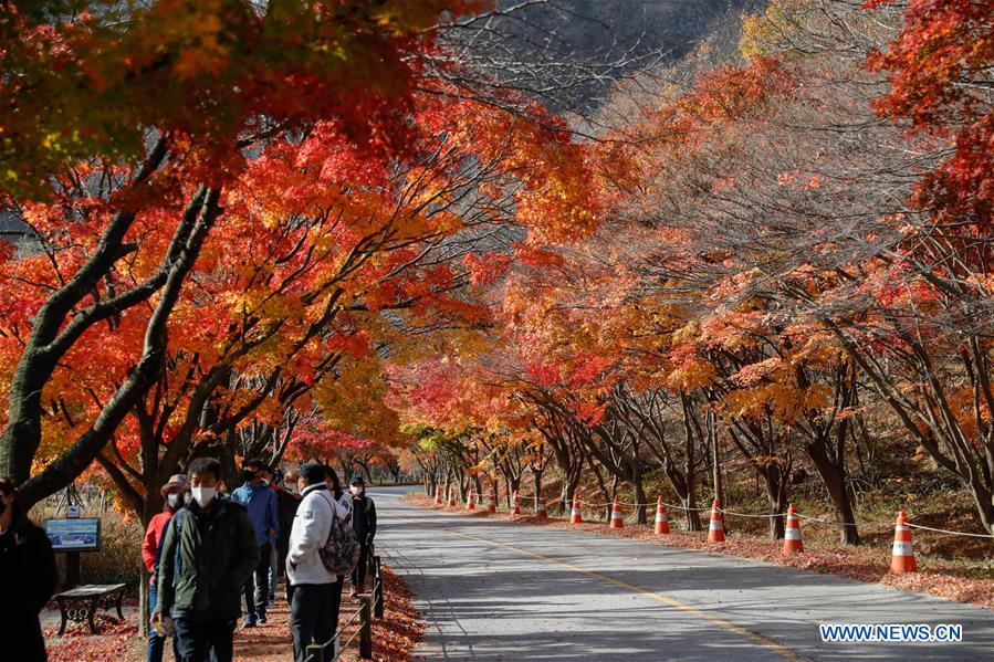 People walk under maple trees at Naejangsan National Park in Jeongeup City of North Jeolla Province, South Korea, Nov. 8, 2020. Naejangsan is a popular tourist destination in South Korea, particularly in autumn due to its spectacular maple scenery. (Xinhua/Wang Jingqiang)