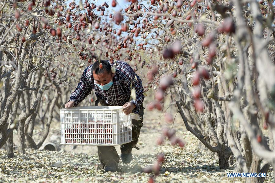 A farmer moves newly-harvested red jujubes in Hotan County of Hotan Prefecture, northwest China's Xinjiang Uygur Autonomous Region, Nov. 6, 2020. A total of 890,000 mu (about 59,333 hectares) of red jujubes have entered harvest season in the prefecture. The jujube trees cultivation here has increased local villagers' income in recent years. (Xinhua/Ding Lei)