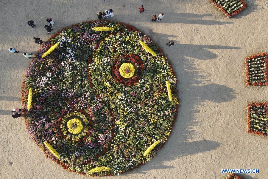 Aerial photo taken on Nov. 8, 2020 shows tourists visiting a chrysanthemum park at Luanxie Village in Shahe City, north China's Hebei Province. The village has introduced high-quality species of chrysanthemum to boost tourism recent years. Over 30,000 pots of chrysanthemum of some 500 species were planted at the chrysanthemum park. (Xinhua/Mu Yu)