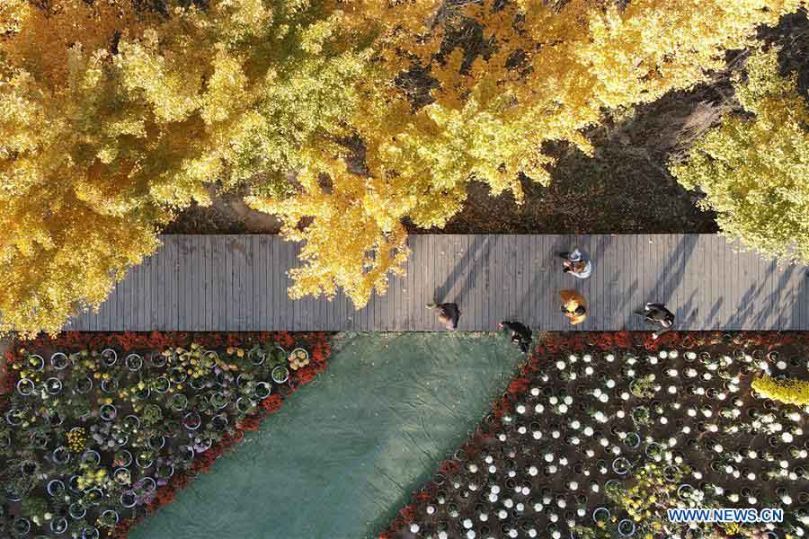 Aerial photo taken on Nov. 8, 2020 shows tourists visiting a chrysanthemum park at Luanxie Village in Shahe City, north China's Hebei Province. The village has introduced high-quality species of chrysanthemum to boost tourism recent years. Over 30,000 pots of chrysanthemum of some 500 species were planted at the chrysanthemum park. (Xinhua/Mu Yu)