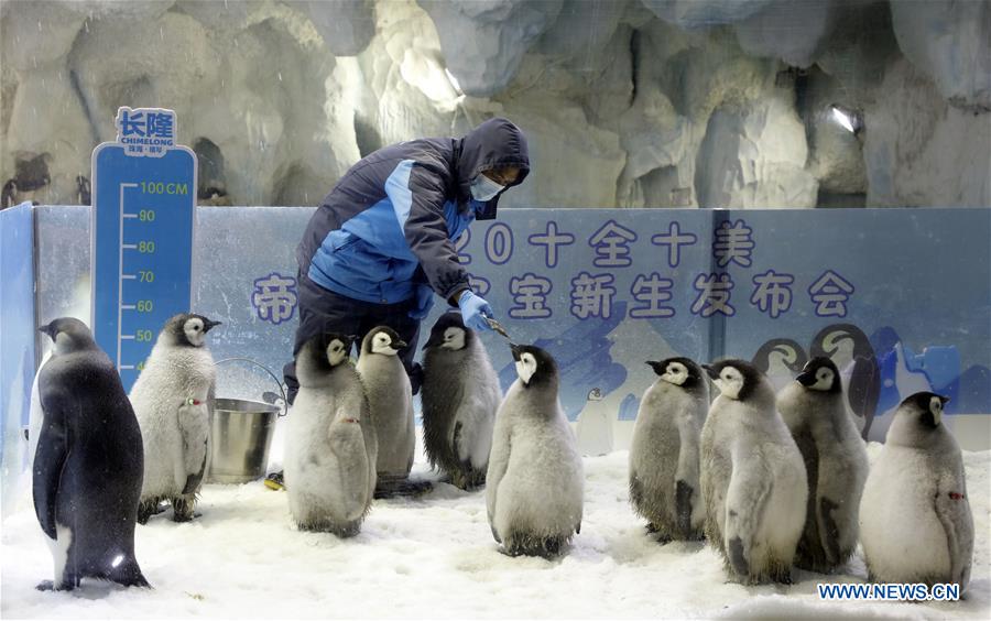 A breeder feeds a baby emperor penguin at Chimelong Ocean Kingdom in Zhuhai, south China's Guangdong Province, Nov. 8, 2020. Ten baby emperor penguins born from June to August this year made their debut here on Sunday. In recent five years, a total of 36 emperor penguins were born in the Chimelong Ocean Kingdom. (Xinhua/Huang Guobao)