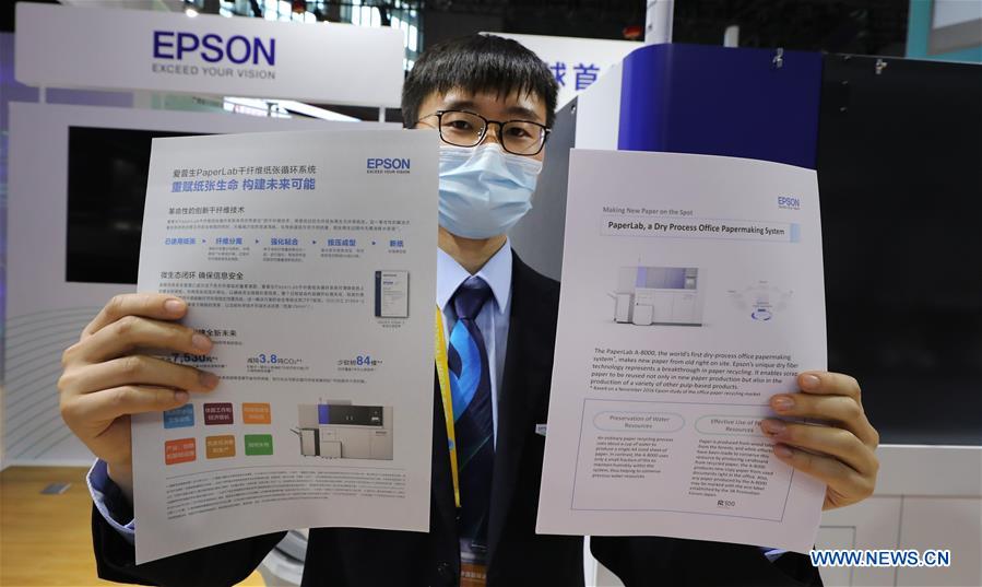 A staff member shows samples using common paper (R) and paper made by Epson's PaperLab recycling system at the booth of Epson at the Intelligent Industry and Information Technology exhibition area during the third China International Import Expo (CIIE) in Shanghai, east China, Nov. 5, 2020. The third CIIE is embracing new entrants, with nearly 50 Fortune 500 and industry-leading companies participating for the first time this year. (Xinhua/Fang Zhe)