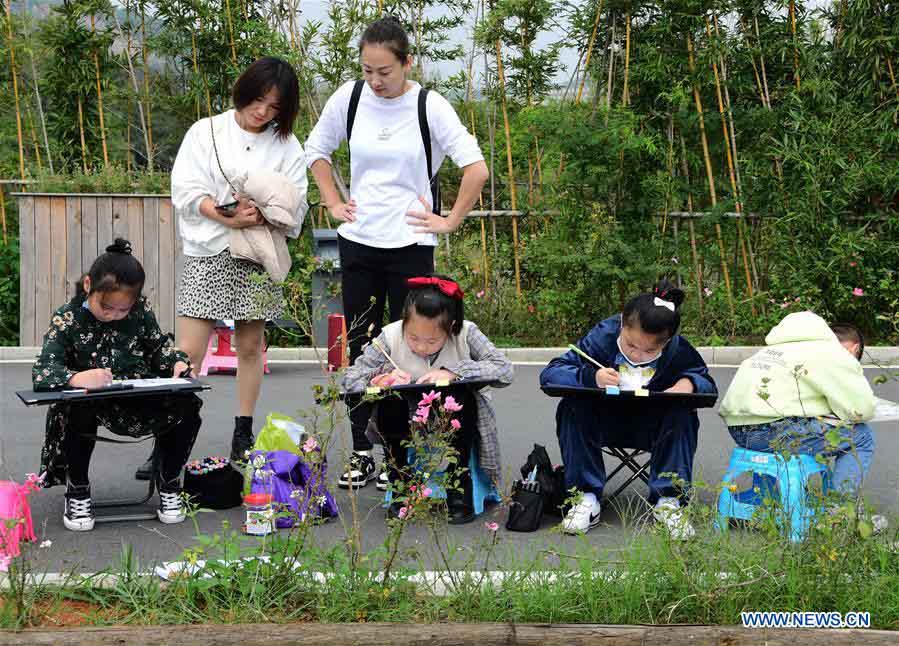 Children draw pictures at the Minjiang River estuary wetland in Fuzhou, southeast China's Fujian Province, Nov. 8, 2020. The estuary wetland is a major concentration area for migratory birds and habitat for waterfowls, including rare species. (Xinhua/Wei Peiquan)