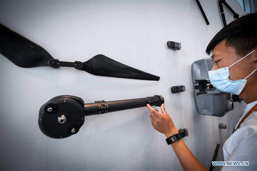 A visitor examines a component of DJI's new crop protection drone T30 after a product launch ceremony in Shenzhen, south China's Guangdong Province, Nov. 9, 2020. Chinese drone maker DJI has launched two new crop protection drones, T30 and T10, here on Sunday. (Xinhua/Mao Siqian)