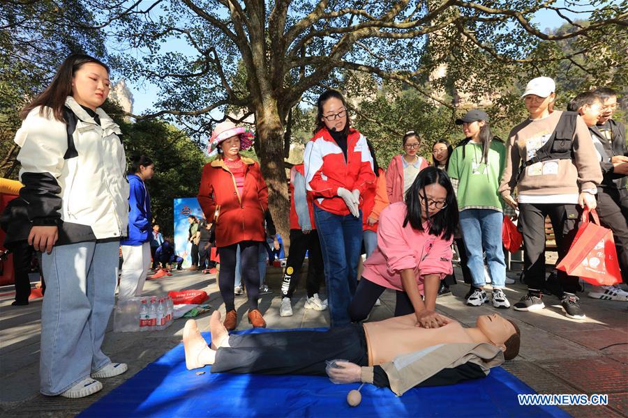 A volunteer shares knowledge on first aid at Zhangjiajie National Forest Park, central China's Hunan Province, Nov. 9, 2020. Many areas around the country carried out fire-fighting exercises and related public educational campaigns on Monday to strengthen people's awareness of fire safety and the capability to cope with emergencies. (Photo by Wu Yongbing/Xinhua)