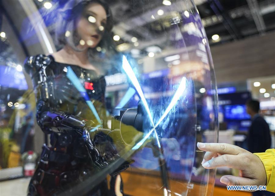 A visitor interacts with a bionic android from EXROBOTS at the Intelligent Industry and Information Technology exhibition area during the third China International Import Expo (CIIE) in Shanghai, east China, Nov. 9, 2020. (Xinhua/Zhang Haofu)