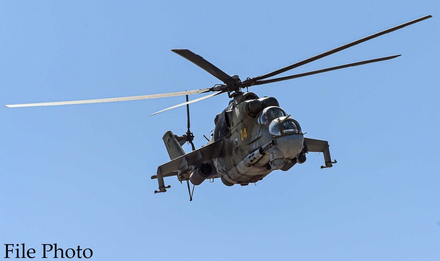 A Mi-24 helicopter flies to the position during the Center-2019 military exercise in Dushanbe region, Tajikistan, on Sept. 18, 2019. (Xinhua/Evgeny Sinitsyn)
