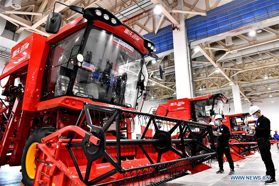 Contestants take part in a combine harvester general troubleshooting event during a national vocational skills competition for agricultural practitioners at a convention and exhibition center in Weifang, east China's Shandong Province, Nov. 9, 2020. (Xinhua/Guo Xulei)