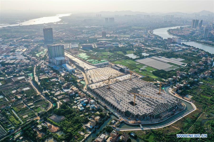 Aerial photo taken on Nov. 9, 2020 shows the construction site of the Longzhen train depot of Guangzhou Metro Line 18 in Guangzhou, south China's Guangdong Province. Shaped like a guitar, the Longzhen train depot takes up an area of 210,000 square meters. When it is finished, the facility will function as a maintenance center for trains of Guangzhou Metro Line 18, a subway line which is also under construction with a maximum designed speed of 160 kilometers per hour. (Xinhua/Liu Dawei)