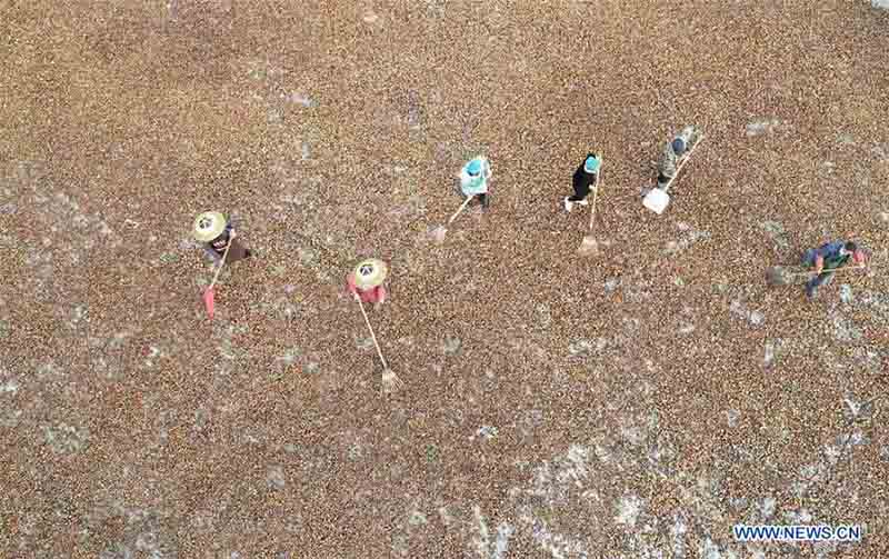 Aerial photo taken on Nov. 8, 2020 shows villagers airing fruits of oil-tea camellia at an oil-tea factory in Songtao Miao Autonomous County, Tongren City, southwest China's Guizhou Province. More than 180,000 mu(about 12,000 hectares) of oil-tea camellia have been planted here in Songtao to boost income of local villagers. (Photo by Long Yuanbin/Xinhua)