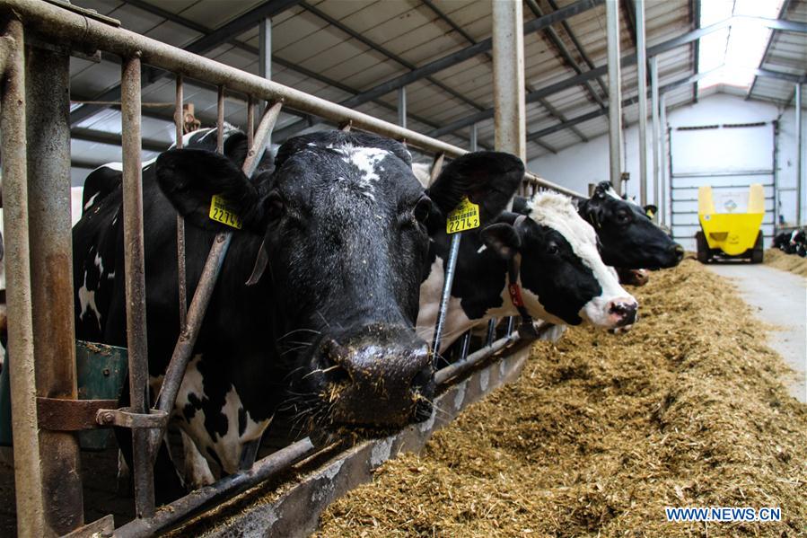 Photo taken on April 19, 2017 shows a cow farm in the village of Lipnice, near the Polish capital of Warsaw. The European Union (EU) is one of the largest milk suppliers to Chinese market, with Poland accounting for a share of 12.7%, according to Director of Polish Milk Chamber Agnieszka Maliszewska. Statistics from Poland's Ministry of Finance show that, despite the impact of COVID-19, the export of dairy products from Poland to China grew by 70% year on year in the first half of 2020. Recently, batches of Polish dairy products took freight trains to China for the occassion of Single's Day shopping festival in the country. (Xinhua/Chen Xu)