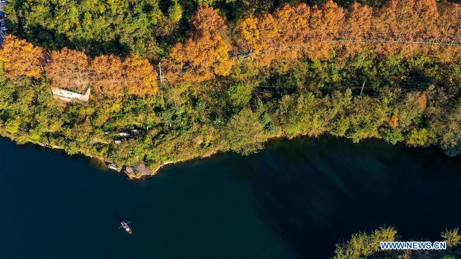 Aerial photo taken on Nov. 10, 2020 shows a boat sailing in the Aha Lake National Wetland Park in Guiyang, southwest China's Guizhou Province. (Xinhua/Ou Dongqu)