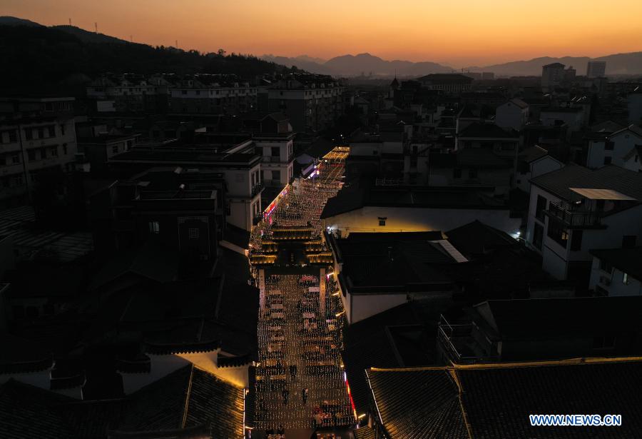 Aerial photo taken on Nov. 10, 2020 shows a night market in Shouchang Township of Jiande City, east China's Zhejiang Province. Shouchang, a small town in mountainous area of Zhejiang, has set up a special night market bringing together night-time booths and more than 30 restaurants, in an effort to enrich people's leisure time and boost local economy. The night market has received over 720,000 tourist trips and raked in 76.33 million yuan (about 11.57 million U.S. dollars) since it opened during the Labor Day holiday. (Xinhua/Weng Xinyang)