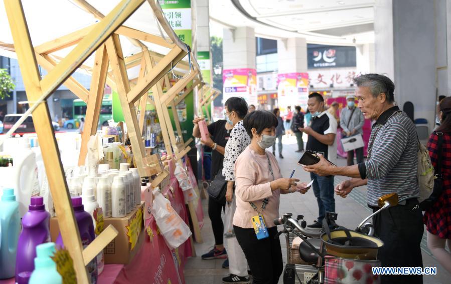 People purchase goods at booths during a shopping festival in Guangzhou, capital of south China's Guangdong Province, Nov. 11, 2020. A shopping festival is held in Guangzhou on Wednesday, the day as China launched its largest annual online shopping event, known as Singles' Day or Double Eleven. (Xinhua/Lu Hanxin)