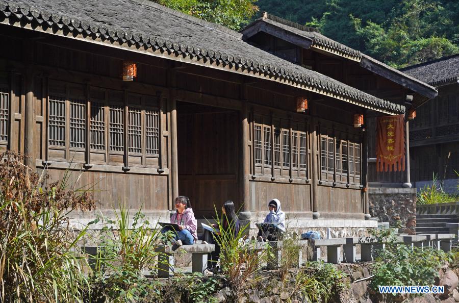 Students draw from life in Dajue Mountain Scenic Area in Zixi County, east China's Jiangxi Province, Nov. 11, 2020. Dajue Mountain Scenic Area, boasting its beautiful scenery and buildings in antique styles, becomes a popular spot for fine art majors. (Xinhua/Wan Xiang)