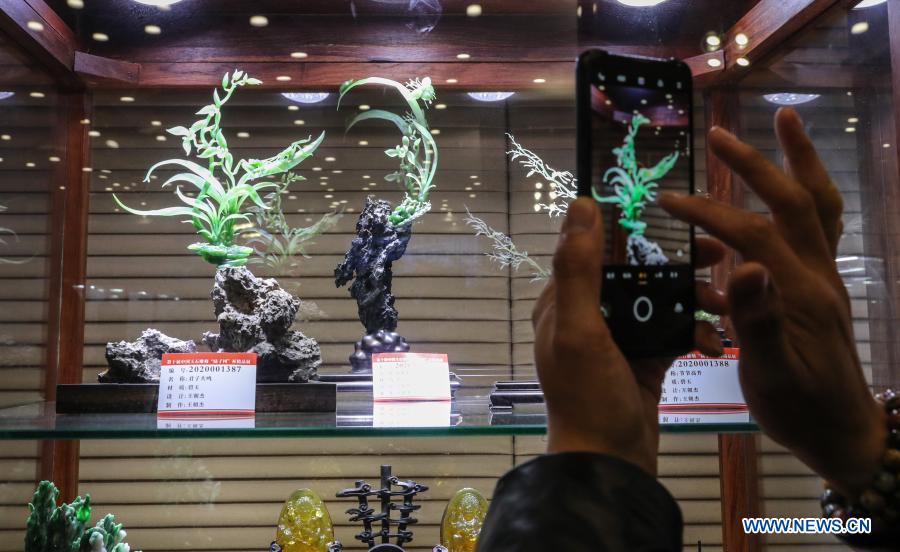 A visitor takes photos of jade artworks during a jade cultural festival in Suzhou, east China's Jiangsu Province, Nov. 11, 2020. The 12th China Suzhou jade cultural festival and the 10th China selected jade sculpture exhibition kicked off on Wednesday, showcasing 1,586 pieces of jade artworks. (Xinhua/Yang Lei)