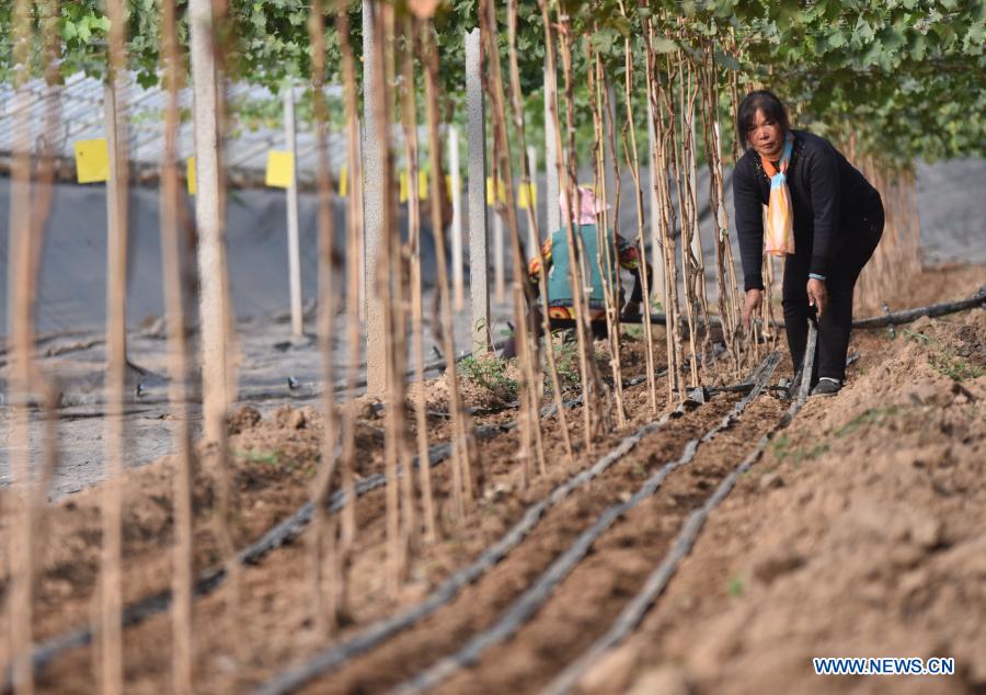 A farmer lays drip irrigation pipes in a grape greenhouse in Niuzhai Village of Zaoyuan Township in Weixian County, north China's Hebei Province, Nov. 11, 2020. In recent years, Weixian County has been committed to upgrading its agricultural structure, as a way to boost farmers' income. Currently the planting area of grapes in the county has exceeded 2,000 mu (about 133.33 hectares). (Xinhua/Zhu Xudong)