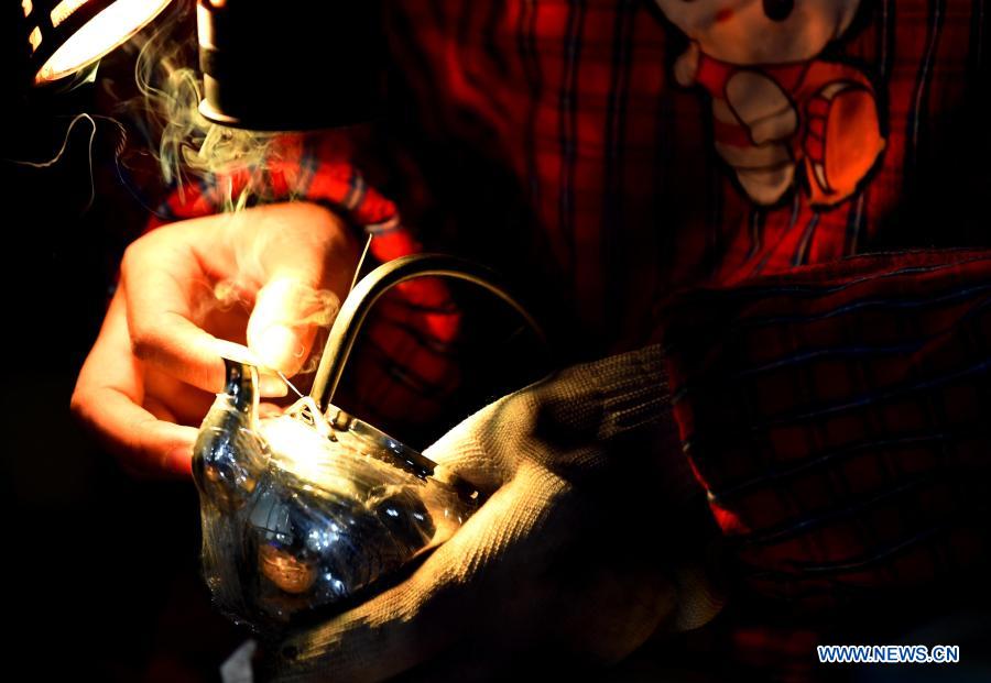 A worker welds a piece of gold and silver ware at a workshop in Baimasi Town of Luolong District in Luoyang, central China's Henan Province, Nov. 11, 2020. The traditional making technique of gold and silver ware of Baimasi Town, a provincial intangible cultural heritage of Henan, is featured with many hand-made steps. (Xinhua/Hao Yuan)