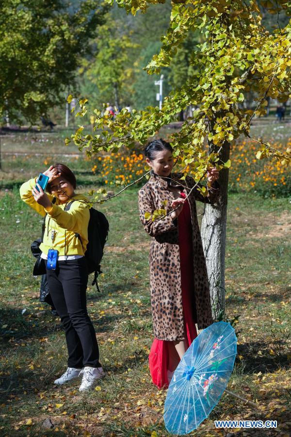 Tourists visit a park of ginkgo trees in Xiaopu Township of Changxing County, east China's Zhejiang Province, Nov. 12, 2020. More than 30,000 ginkgo trees here have attracted lots of visitors as the leaves change colours in autumn. (Xinhua/Xu Yu)
