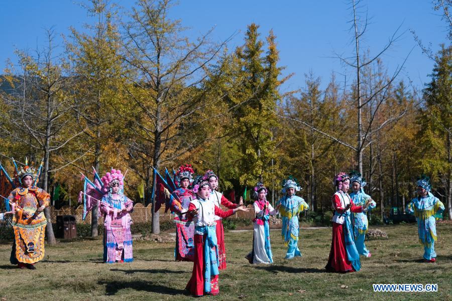 Children perform Peking Opera at a park of ginkgo trees in Xiaopu Township of Changxing County, east China's Zhejiang Province, Nov. 12, 2020. More than 30,000 ginkgo trees here have attracted lots of visitors as the leaves change colours in autumn. (Xinhua/Xu Yu)